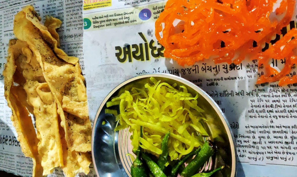 This was the kick start to our journey. Had some yummy parathas and snacks and managed our luggage. Enjoyed listening to some songs and beautiful scenery, and recollected our college days. The climate started becoming cold as we crossed the Maharashtra border. Next day at 7:30 am we reached Bhuj Station and went out searching for some transport to reach Kutch. When you are in Gujarat, your brekkie has to be Jalebi Fafda and the delicious papaya chutney. Rented a cab and then continued our journey to kutch. The climate was pleasant and enjoyed our smooth ride. Reached kutch within an hour, checked in at Nova Patghar tents, got freshened up and headed out for lunch. We had authentic Gujarati thali with buttermilk. Got our pictures clicked at the empty roads of Kutch surrounded by white sand on both the sides.